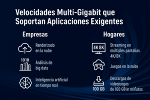 En 2025, la fibra óptica habilita planes residenciales de 1 a 10 Gbps y conexiones empresariales que superan los 25 Gbps en entornos especializados.